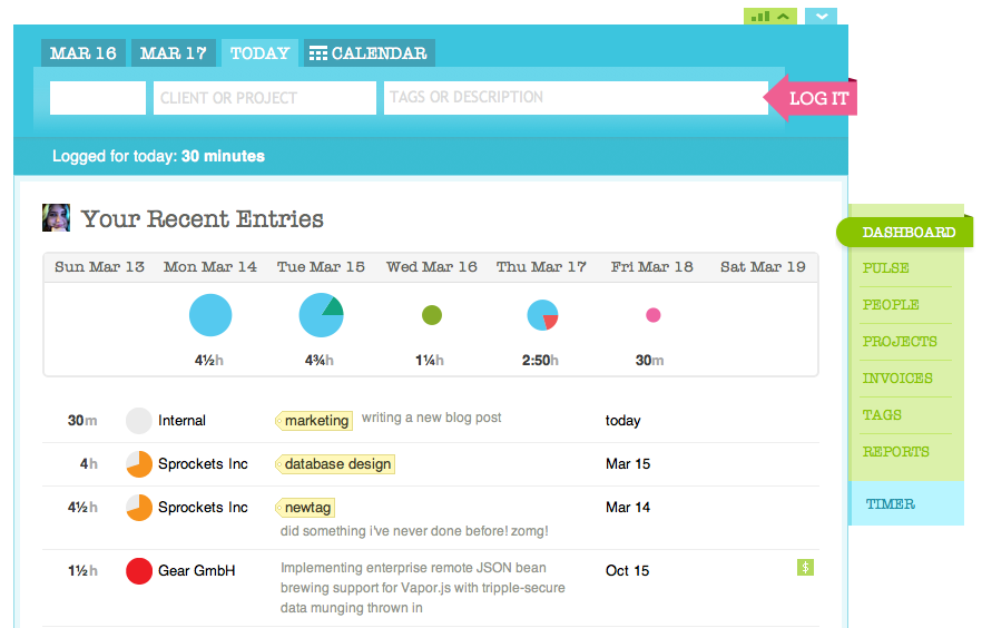 Hover of any of the circles to see details, and click them to hop to a detailed report of your work on that day.