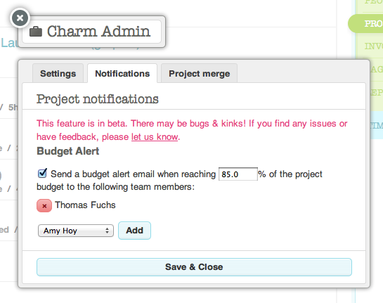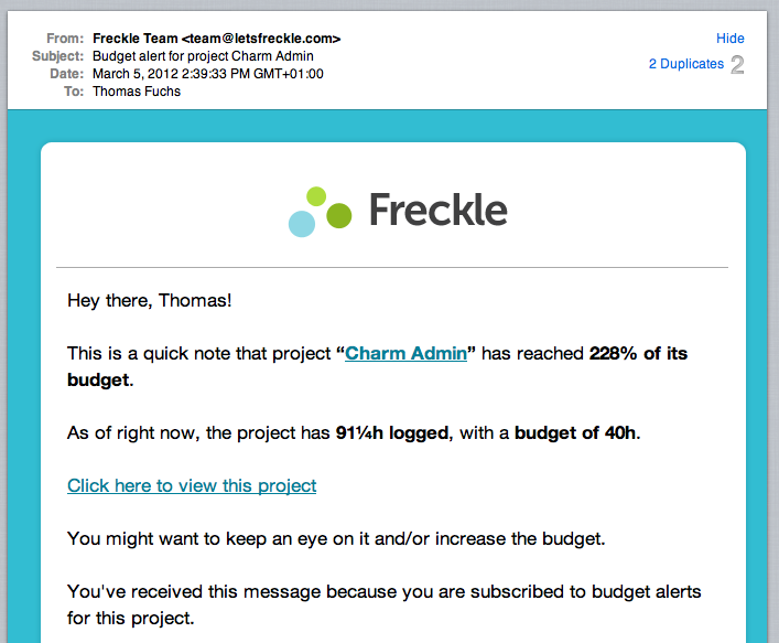 If you never want to go over budget again (or at least know when you are!), you can use Freckle’s Budget Alert feature. Get an email in your inbox as soon as a project reaches a defined-by-you percentage of its budget.